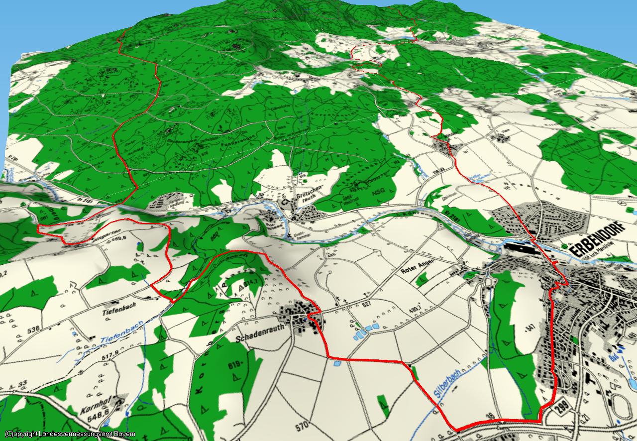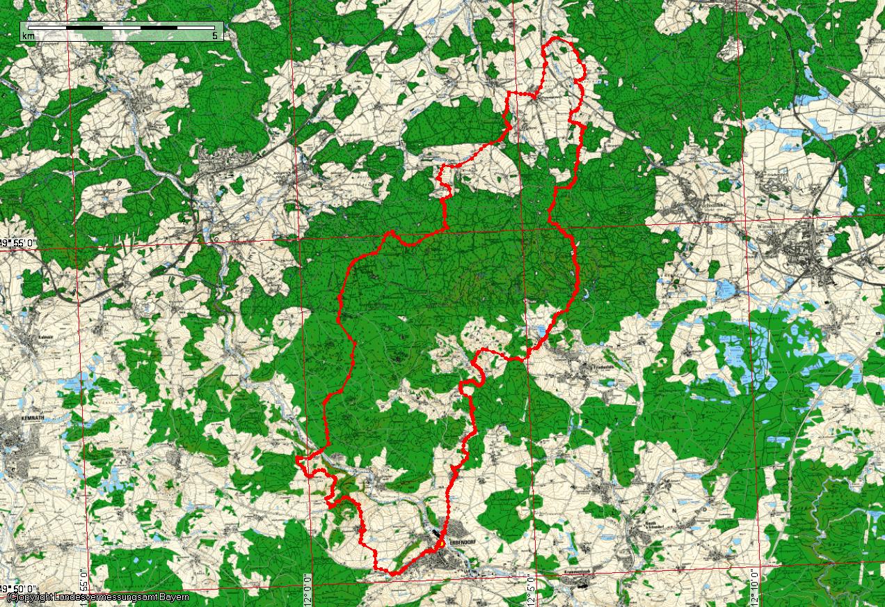Route: Vom Parkplatz rechts bergab und nach der Naab-Brücke rechts und gleich wieder links nach Wetzeldorf. Dort die Kreisstrasse überqueren und auf der alten Strasse nach Boxdorf. Bei der Einmündung auf die Teerstraße rechts und immer auf diesem Weg bleiben, bis man kurz vor Erreichen der Strasse rechst in Richtung Grenzmühle abbiegt. An dieser Vorbei und rechts auf die Fahrstrasse einbiegen. Vor dem alleinstehenden Haus links nach Frauenreuth abbiegen, Frauenreuth durchqueren und am Weiher entlang auf der alten Strasse zur “Bergrennstrecke” (St2121). Diese queren und bergab. Nach dem Bach links steil auf einem Forstweg bergan. Zweimal rechts halten in Richtung Herzogöd. Am Wald entlang und die Fahrstrasse queren. Nach links und wieder rechts ist man an der St2170. Diese quert man. In Helmbrechts rechts an der Stieglmühle vorbei kommt man wieder zur St2170. Auf dieser geht es nun ein kurzes Stück links, bevor man rechts nach Poppenreuth abzweigt. In Poppenreuth die erste rechts in Richtung Walbenreuth. Auf halben Weg links ab auf einen Feldweg. Diesen einmal gerade auf kleineren Waldweg verlassen, der wieder in die TIR13 mündet. Dieser bis Gefällmühle folgen und links abbiegen. Einmal links und dann rechts auf einen Feldweg abbiegen, der zu einem Wiesenweg wird. Rechts auf den Forstweg einmünden und dann links halten. In der Kurve auf einen schmalen Pfad. Diesen bei dessen Einmündung auf die Froststrasse nach rechts verlassen. Nach einmal links und einmal rechts abbiegen sollte man den Steinwald an der Fichtelnaabbrücke bei Rosenbühl verlassen. Nun der Teerstraße in Richtung Zwergau bergauf folgen und rechts nach Bingarten abbiegen. Vor Tiefenbach rechts und dann links ins Tiefenbachtal. Dort rechst auf einen Pfad bergauf, der in einen Forstweg mündet. Diesen nach rechts auf die alte Strasse verlassen, die in Schadenreuth mündet. Kurz rechts und gleich wieder links. Nach Schadenreuth rechst und links quert man eine Teerstraße und gelangt in ein Neubaugebiet Erbendorfs. Immer auf dieser Strasse bleiben gelangt man zum Stadtpark, Dahinter ist der Parkplatz.
