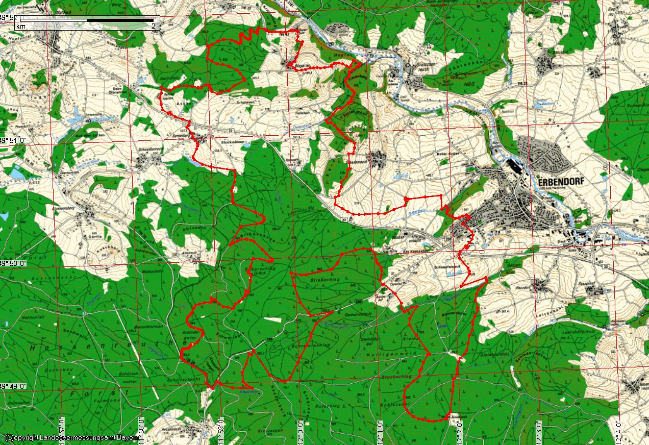 Route: Vom Parkplatz rechts hoch und über die B299 hoch ins Wohngebiet. Oben rechts und die dritte links dem Pfad durch den Wald bergab folgen und nach dem Grenzbach links auf die Teerstraße. Gleich wieder nach rechts und an der Einmündung nach links abbiegen. An der Unterstellhalle links und gleich wieder rechts abbiegen. Nun immer dem Hauptweg am Haus vorbei bis zur Teerstraße folgen. Hier rechts und gleich wieder links abbiegen. Am Waldrand entlang und am Wegende rechts und gleich wieder links. Über die Teerstraße hoch zum Festplatz auf der Schadenreuther Platte. Dort links bergab und dem Weg rechts in den Wald folgen. Hier immer auf dem verfallenen Weg bleiben, bis man am Tiefenbach wieder auf einen Fahrweg trifft. diesem nicht folgen, sondern rechts am Bach entlang. Vor der Brücke wieder rechts bergauf und beider Einmündung auf den Forstweg wieder links bergab bis man erneut den Tiefenbach kreuzt. Danach weiter rechts am Bach entlang, bis links der Wanderweg (blauer Pfeil nach links auf weissem Grund) steil bergauf führt. Immer auf diesem Weg bleiben und an einem exponierten Hochsitz vorbei die Fahrstrasse nach Bingarten querend immer auf diesem Weg bleiben, bis er die 2. Teerstraße trifft. Auf dieser rechts bergab nach Bingarten und dort rechts halten. Nach dem Dorf links zunächst auf Teer bergab. Am Wegende links am Waldrand entlang und am Waldende erneut rechts bergab bis Rosenbühl. Dort links auf die TIR 32 und bis zur nächsten Kreuzung bergauf. Hier geradeaus auf den Forstweg bergauf wechseln und diesem durch die Serpentinen folgen. Oben links auf einen verfallenen Weg wechseln und dann erneut links auf den Wanderweg abbiegen. Diesem zunächst folgen und kurz vorm Waldrand rechts auf altem Weg bergab. an der Einmündung rechts bergab halten. Am Waldrand rechts auf dem Weg bleiben und dem Wanderweg bis zum Gasthaus Waldfrieden (Hahnenehgarten) folgen. An diesem vorbei und vor der B22 links und sofort wieder rechts. Nun nach rechts die B22 unterqueren und in Guttenberg geradeaus zu den Weihern hinab. Dort links halten und an der Einmündung auf den geteerten Weg wieder rechts. Am Schiessplatz auf altem, sehr steilen Weg vorbei und oben an der Forstautobahn links. Dieser eine Zeit lang folgen und dann auf ruppigem Pfad bergab zur nächsten Forstautobahn (GPS!). Auf dieser links halten und dann erneut nach rechts auf stark verfallenem Weg hinab zur TIR 28 (GPS!). Auf dieser links und an der Einmündung der B299 links und sofort wieder rechts abbiegen. Nun links auf einem Pfad bergauf folgen. Oben scharf links auf die Forstautobahn, dann rechts dem Pfad zum Parkplatz hinauf folgen. Dort rechts halten und oben angelangt links abbiegen. Jetzt immer geradeaus (alle anderen Wege ignorieren, GPS!) bis man wieder auf einen Forstweg trifft und diesem bis zur B299 folgen. Dort links und dann rechts bergauf. Oben dann rechts bergab, dann links auf altem Weg bergab. Am Forstweg angekommen wieder rechts. Nun immer diesem Hauptweg folgen (hier könnte man links über Paterlhütte abbrechen) erneut bis zur B299. Diese queren und an Aschenhof vorbei und auf stetig schlechter werdendem Weg hinunter an den Grenzbach. Diesem auf “Trial-Brücke” überfahren und danach links halten. Nach rechts bergauf abbiegen und immer gerade bleiben bis man wieder auf eine Forstautobahn kommt. Dieser kurz nach rechts folgen und gleich wieder nach links abbiegen. dem alten Weg bis zur nächsten Forstautobahn folgen. Dabei die letzten Meter auf freier Wegewahl. Diesem Weg rechts bis nach Birkenreuth folgen. Vor dem verfallenden Haus links abbiegen und nun immer dem OWV-Wanderweg folgend bis hinunter zum Grenzbach. Dabei mehrfach der Ausschilderung folgend abbiegen. Nach der Bachbrücke links. Die nächste Einmündung dann steil rechts bergauf. Der Weg führt nun gerade zurück auf den Startpunkt.
