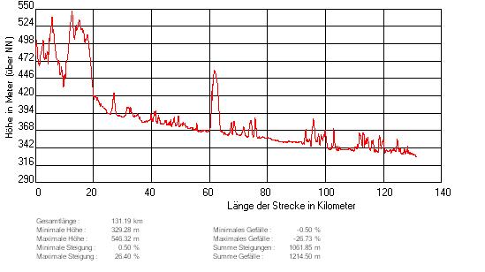 Charakteristik: Auf durchwegs guten bis sehr guten Teerstrassen bis nach Regensburg mit nur 3 kleineren Anstiegen von je ca. 100 hm. Lange Drückerpassagen. Weitgehend ideale Strecke für Aeroposition. Eine leicht kurvige Abfahrt.